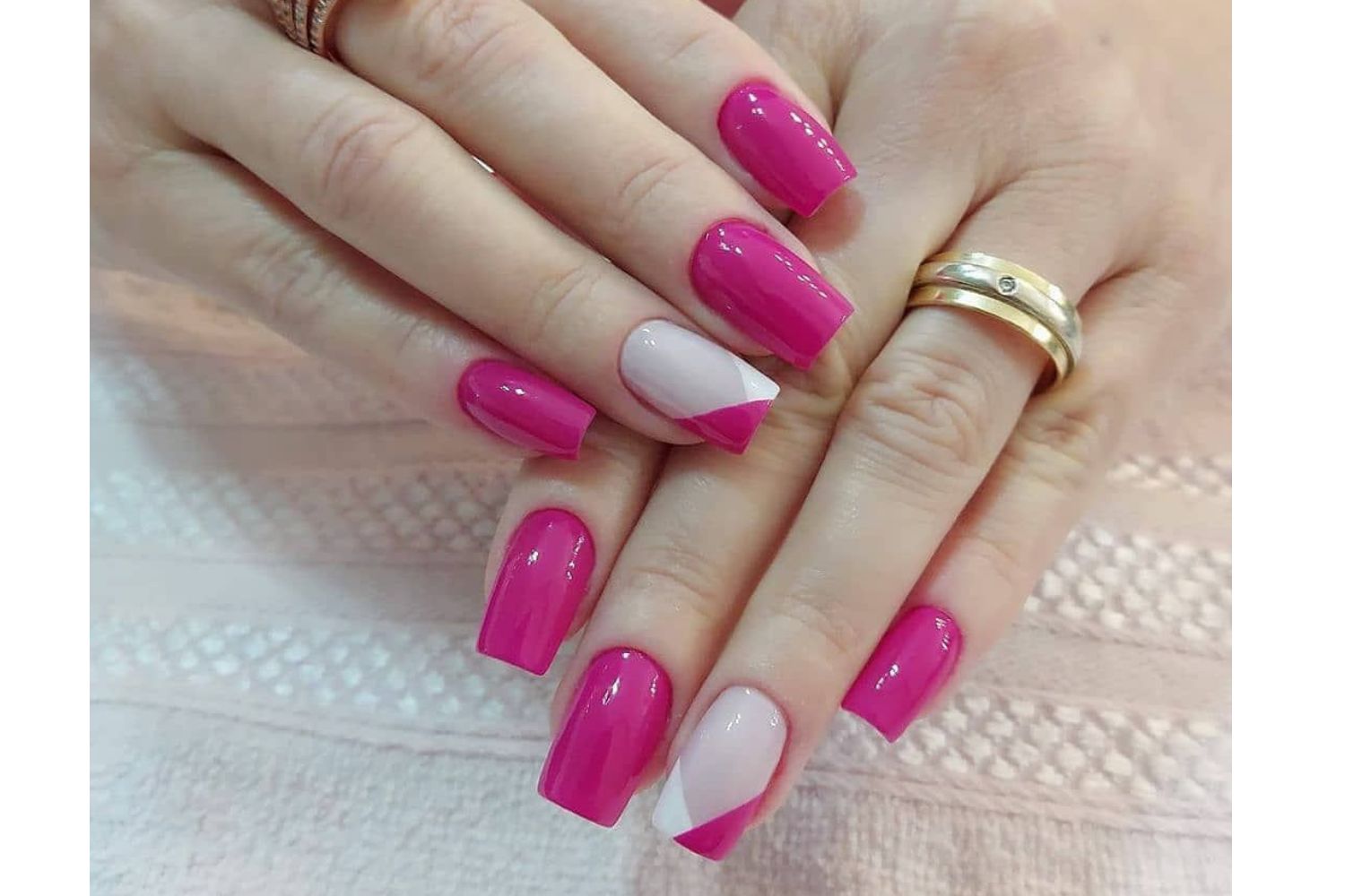 No exemplo acima, além da cor exuberante em quatro unhas, a nail art ainda conta com o charme da filha única divida entre o branquinho clássico da francesinha e o rosa.
