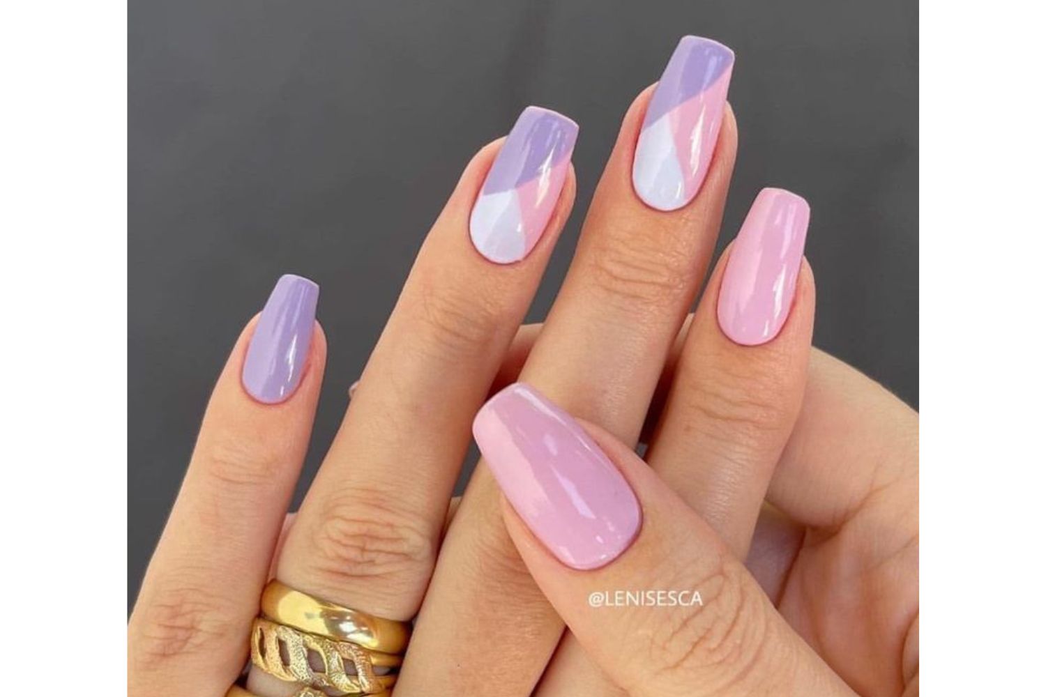 Outra forma linda de usar o rosa nas unhas, é colocando-o ao lado de cores que formam complementos, como é o caso do lilás e do branco do exemplo acima.