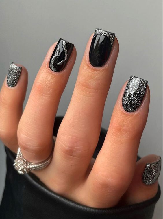 Uma das opções mais deslumbrantes para o inverno é a combinação de esmalte preto com glitter. O brilho dá um toque de sofisticação, destacando a cor escura das unhas de forma elegante e chamativa.