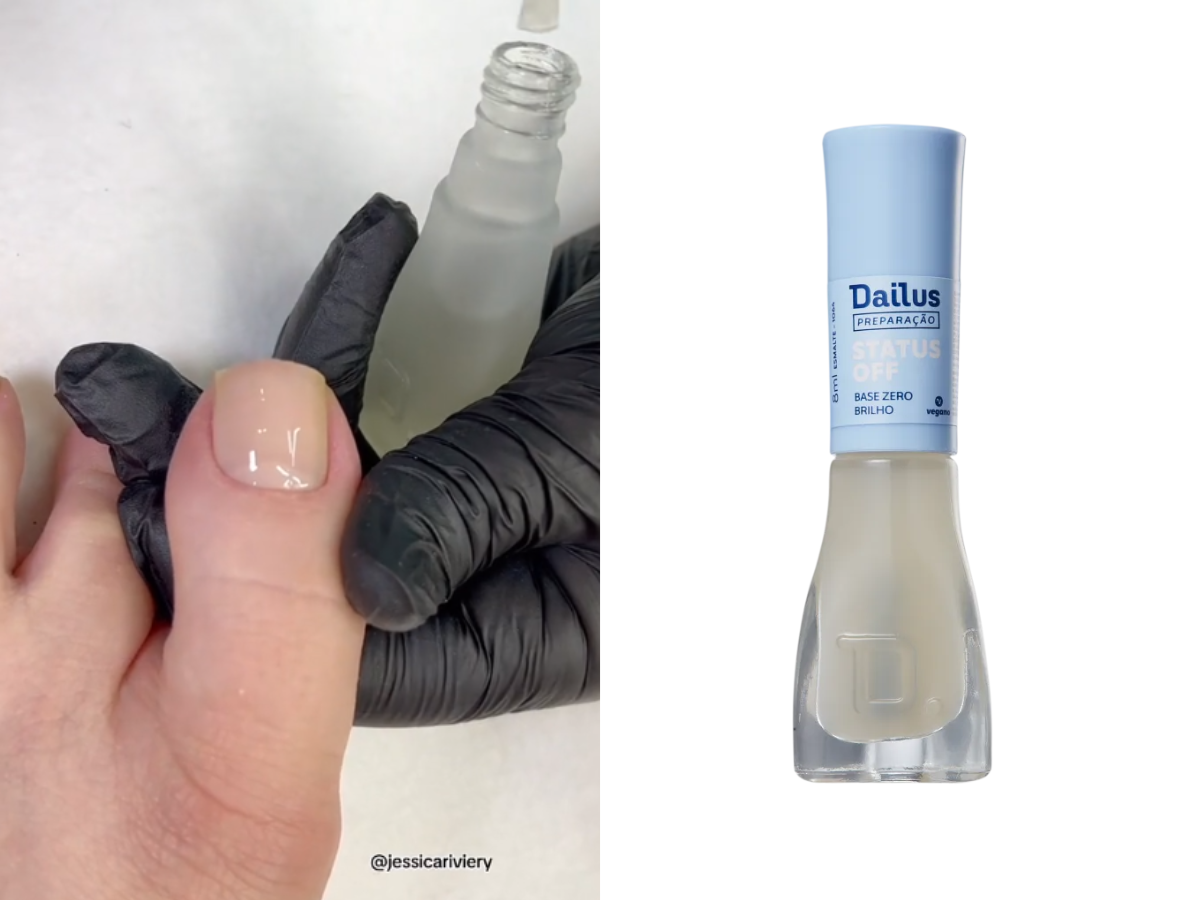 Em seguida, comece a criar as camadas da base da francesinha. No vídeo que bombou no Tik Tok, por exemplo, a nail designer recomenda a marca Dailus em específico, sendo: Colar de Pérola, para um fundo diferenciado e também o esmalte Suspiro, que é um branco transparente para dar acabamento.