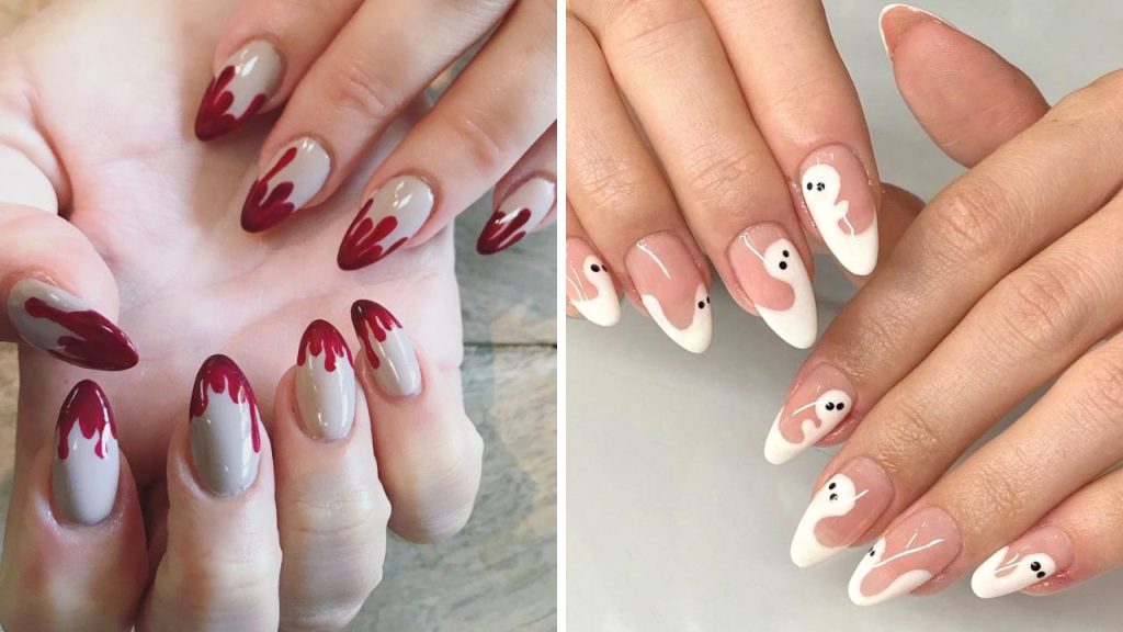 As unhas manchadas de sangue oferecem um visual mais artístico, com manchas de esmalte vermelho aplicadas de forma irregular sobre uma base clara.