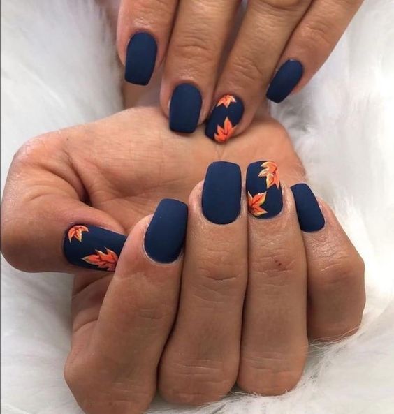 5. Azul-marinho fosco, assim como decorado com folhas, está entre as imagens de unhas decoradas mais procuradas