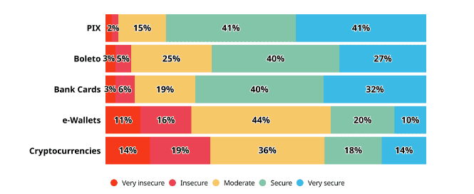 Seguindo a lista dos mais seguros, Boleto e carteiras digitais aparecem na sequência, com as criptomoedas na última colocação mais uma vez.