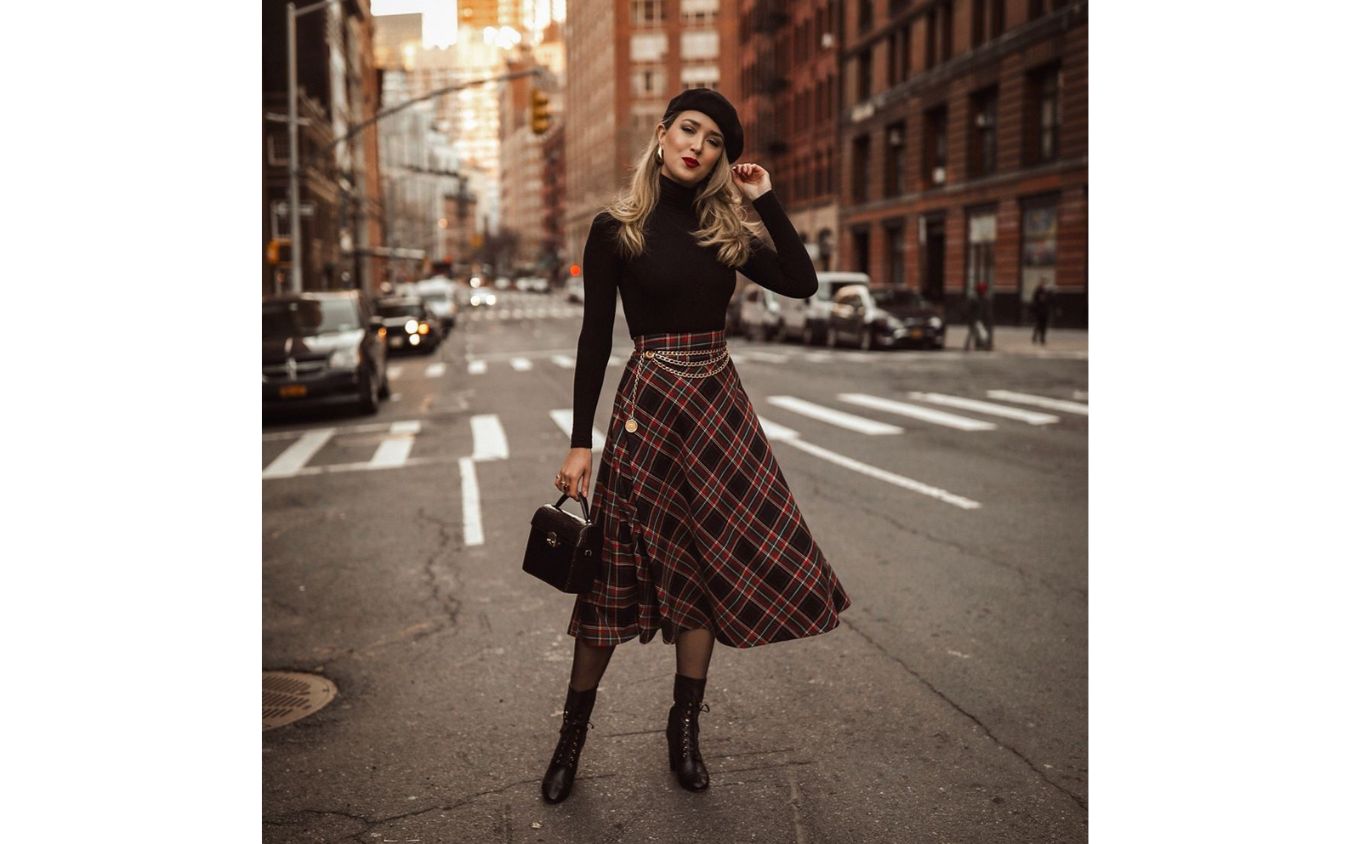 A saia em comprimento midi em estampa tartan é um clássico do inverno e pode ser combinada de várias formas.