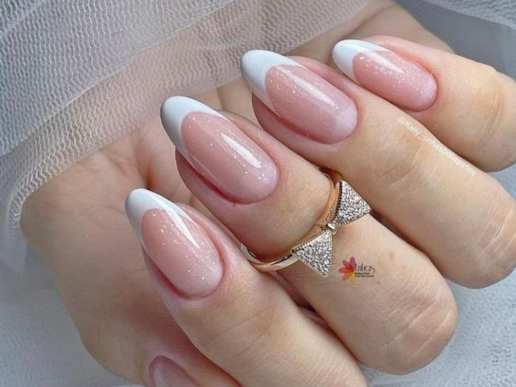 Começamos nossa lista com a clássica francesinha, porém dessa vez em unha almond. A nail art nunca sai de moda e com o formato ganha ainda mais beleza. Também é possível adicionar um toque de brilho a composição, tornando todo o visual incrivelmente charmoso.