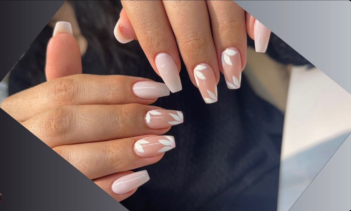O nude com desenhos brancos delicados funciona bem para quem gosta de unhas decoradas sem exagero. Os desenhos lembram pétalas ou folhas, e o estilo combina tanto com o dia a dia quanto com eventos mais casuais.