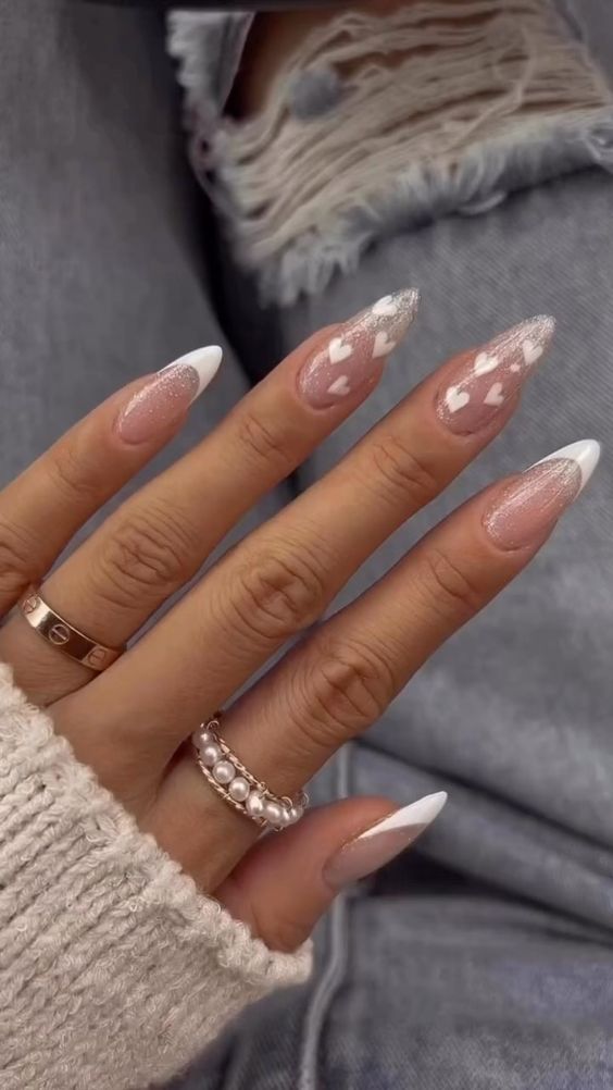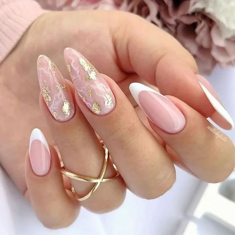 O efeito de mármore é um estilo elegante e sofisticado para as unhas brancas com brilho. Você pode usar diferentes cores de glitter para criar um visual personalizado. Também vale incluir padrões de mármore na unha com o esmalte branco com glitter dourado para criar um efeito completo.