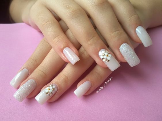 E quem disse que flores não combinam com unhas brancas e brilho? Aqui elas podem trazer ainda mais charme e elegância quando unidas as flores preferidas. Portanto, aposte em brilho em algumas unhas com flores e terá um resultado incrível.