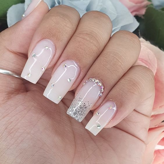 Como primeira opção, você pode usar glitter em toda a unha ou apenas em alguns pontos se quiser unhas brancas com brilho. A opção traz um visual moderno caso crie uma filha única, por exemplo. O esmalte fosco, por sua vez, também combina bem.