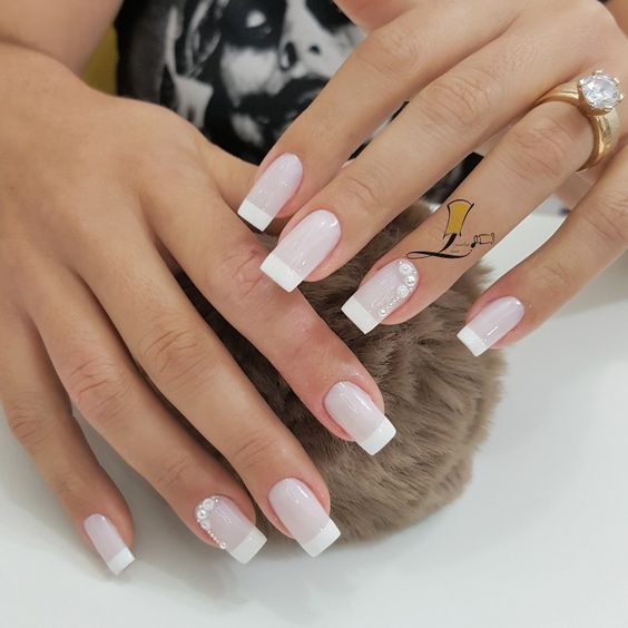 Você pode usar um esmalte branco para a base e um esmalte colorido ou com glitter para a pontinha, assim como apostar nos strass. O resultado é incrível.