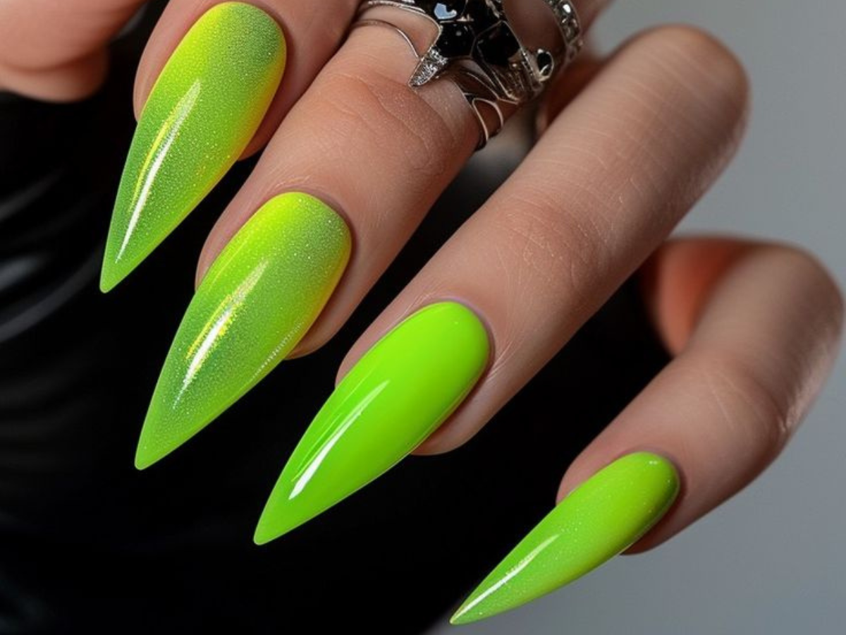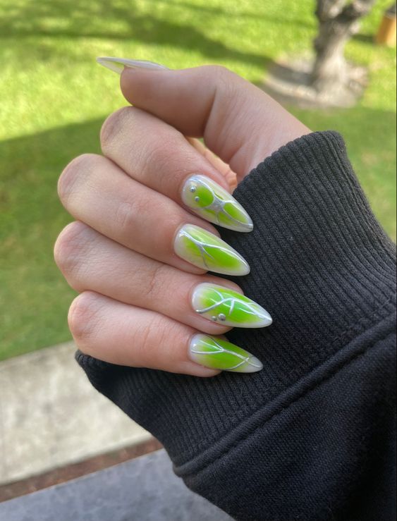 Elementos como pedras, pérolas ou desenhos em relevo podem criar uma nail art que realmente se destaca. O contraste entre o verde neon e os detalhes em 3D cria um visual futurista e inovador, ideal para quem gosta de estar à frente das tendências.