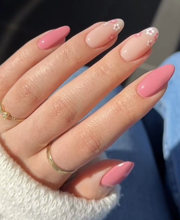 A nail art de flores pequenas sobre um esmalte nude rosado traz um visual delicado e alegre.