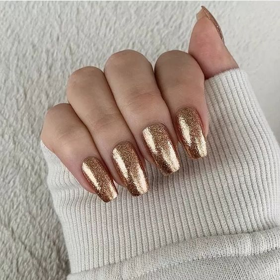 6. Totalmente dourada com brilho, no entanto, é a cara clássica das unhas de ano novo para você investir sem medo